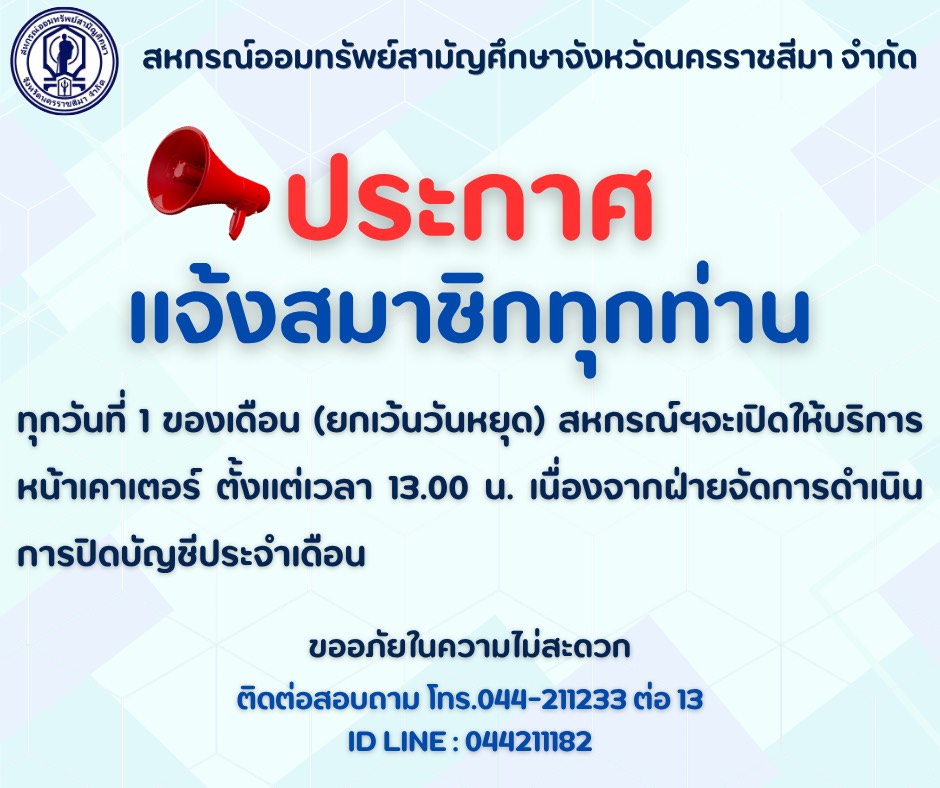 ข่าวประชาสัมพันธ์ประกาศงดให้บริการครึ่งวัน Bumbiw.342 ชั่วโมง ago01 mins Related posts:ประกาศรายชื่อผู้สมัครรับเลือกตั้ง คณะกรรมการชุดที่ 34เชิญประชุมใหญ่วิสามัญ ครั้งที่ 1/2568มาตรการช่วยเหลือสมาชิกในการผ่อนผันการส่งชำระหนี้2568FacebookFacebookLINELine แนะแนวเรื่อง Previous: ประกาศสมาชิกที่มีวงเงินกู้ฉุกเฉิน ATM