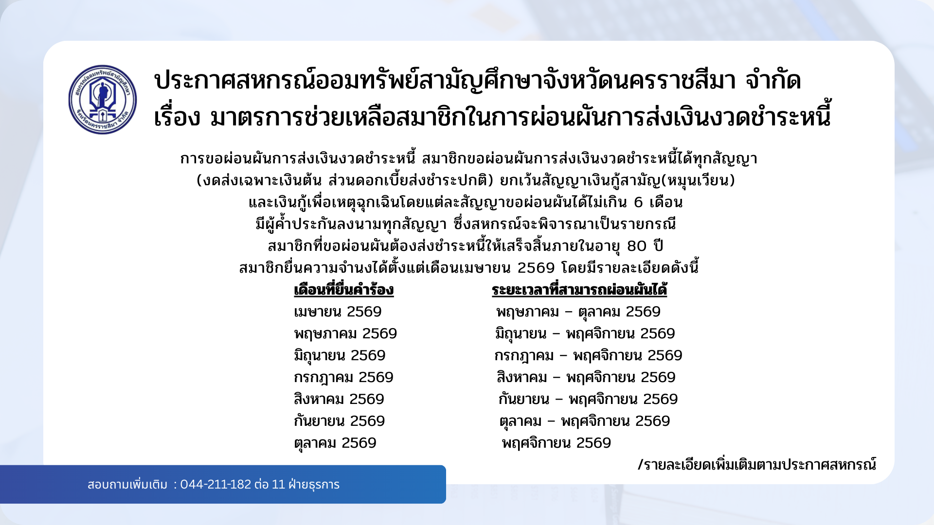 ข่าวประชาสัมพันธ์ประกาศลดอัตราดอกเบี้ย Bumbiw.342 เดือน ago01 mins CCF23012569 Related posts:โครงการเงินกู้สามัญกรณีพิเศษเพื่อเสริมสภาพคล่อง (ไม่มีเฉลี่ยคืน)ประกาศรับสมัครเลือกตั้งกรรมการประจำปี 2568โครงการส่งเสริมการออมFacebookFacebookLINELine แนะแนวเรื่อง Previous: เรื่องก่อนหน้าNext: รายชื่อผู้มีสิทธิเลือกตั้ง