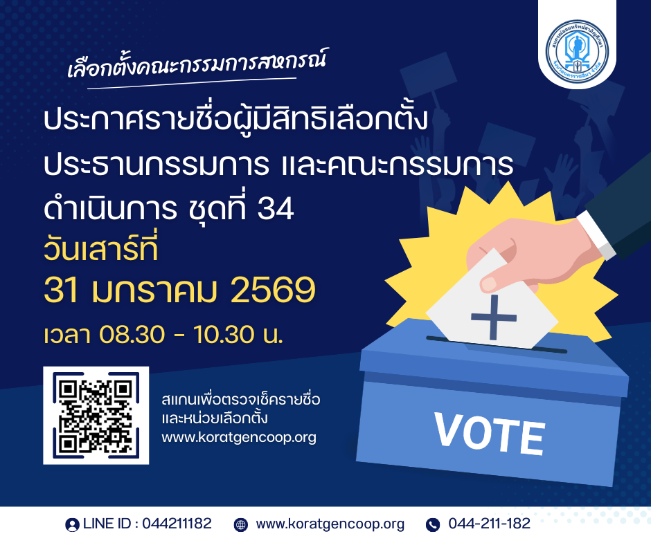 ข่าวประชาสัมพันธ์รายชื่อผู้มีสิทธิเลือกตั้ง Bumbiw.344 วัน ago4 วัน ago01 mins การเลือกตั้งประธานกรรมการ และคณะกรรมการดำเนินการ ชุดที่ 34 วันที่ 31 มกราคม 2569 เวลา 08:30 – 10:30 น. กรุณานำบัตรประจำตัวประชาชนไปด้วยค่ะ รายชื่อผู้มีสิทธิเลือกตั้ง2569(1) Related posts:ขอแสดงความเสียใจอย่างสุดซึ้งกับครอบครัวผู้สูญเสียประกาศโครงการเงินกู้สามัญเพื่อแก้ไขปัญหาหนี้สินสมาชิกที่มีหนี้สถาบันการเงินอื่นประกาศโครงการสินเชื่อสามัญสวัสดิการฌาปนกิจสงเคราะห์FacebookFacebookLINELine เมนูนำทาง เรื่อง Previous: ประกาศลดอัตราดอกเบี้ย